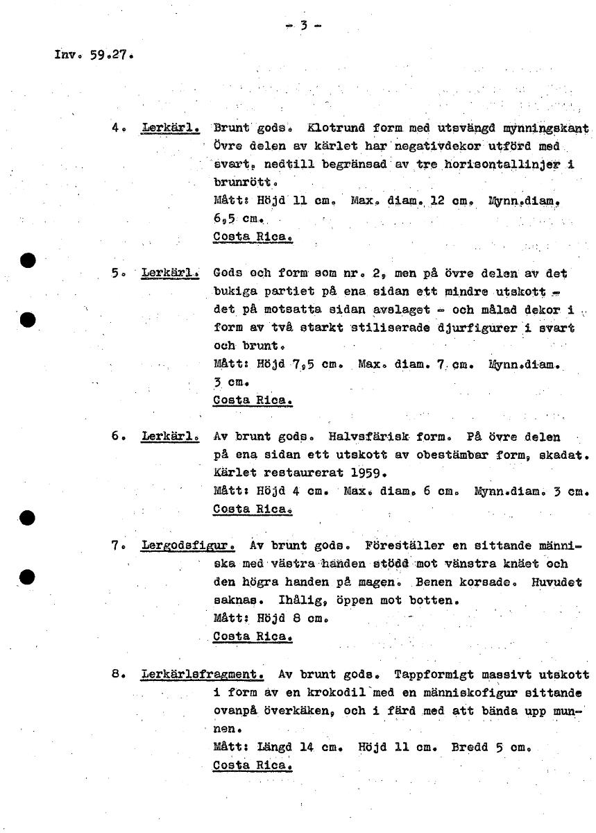 3 Inv. 59.27. 4. Lerkärl Brunt gods, Klotrund form med utsvängd mynningskant övre delen av kärlet har'negativdekor utförd med avart9 nedtill begränsad av tre horisontallinjer i brunrött. Mått: Höjd 11 om. Max. diam., 12 em, MYnn,diam1, 695 em. Costa Rica. • 5, Lerkärl. Gods och form som nr. 2, men på övre delen av det bukiga partiet på ena sidan ett mindre utskott det på motsatta sidan avslaget - och målad dekor i • form av två starkt stiliserade djurfigurer 'i evart och brunt. Mått: Höjd 795 cm, Max. diam. 7,cm. Mynnediam., 3 cm. Costa Rica. 6. Lerkärl° Av brunt goda. Halvsfärisk form. På övre delen på ena sidan ett utskott av obestämbar form9 skadat. Kärlet restaurerat 1959, Mått: Höjd 4 cm. Max, diam, 6 cm, Mynn.diam. 3 em. Costa Rica. 7. Lergodsfigur. ikv brunt gods. Föreatäller en sittande männi- ska med västra-händen eltöddmot vänstra knäet och • den högra handen på magen. Benen korsade. Huvudet saknas. Ihålig, öppen mot botten. Mått: Höjd 8 cm. Costa Rica. 8. Lerkärlsfragmenti Av brunt gods, Tappformigt massivt utskott i form av en krokodil-med en människofigur sittande ovanpå överkäken, och i färd med att bända upp mun7.' nen. Mått; Längd 14 cm. Höjd 11 cm, Bredd 5' om. Costa Rica [ocr]
