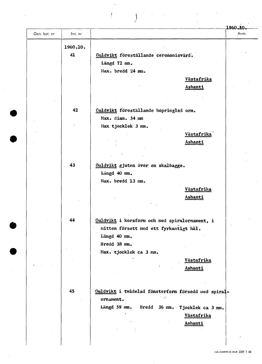 1960.A0. 1960410: 41 Guldvikt föreställande ceremonisvärd: Längd 72 mm. Max. bredd 24 mm. Västafrika Ashanti 42 Guldvikt föreställande hopringlad orm. Max. diam. 34 mm diax tjocklek 3 mm. Västafrika Ashanti 43 Guldvikt gjuten över en skalbagge. Längd 40 mm. Max. bredd 13 mm. Västafrika Ashanti 44 Guldvikt i korsform och med spiralornament, i mitten försett med ett fyrkantigt hål. Längd 40 mm. Bredd 38 mm. Max. tjocklek ca 3 mm. Västafrika Ashanti 45 Guldvikt i tvådelad fönsterform försedd med spir ornament. Längd 59 mm. Bredd 36 mm. Tjocklek ca 3 Västafrika Ashanti [ocr]Stäng