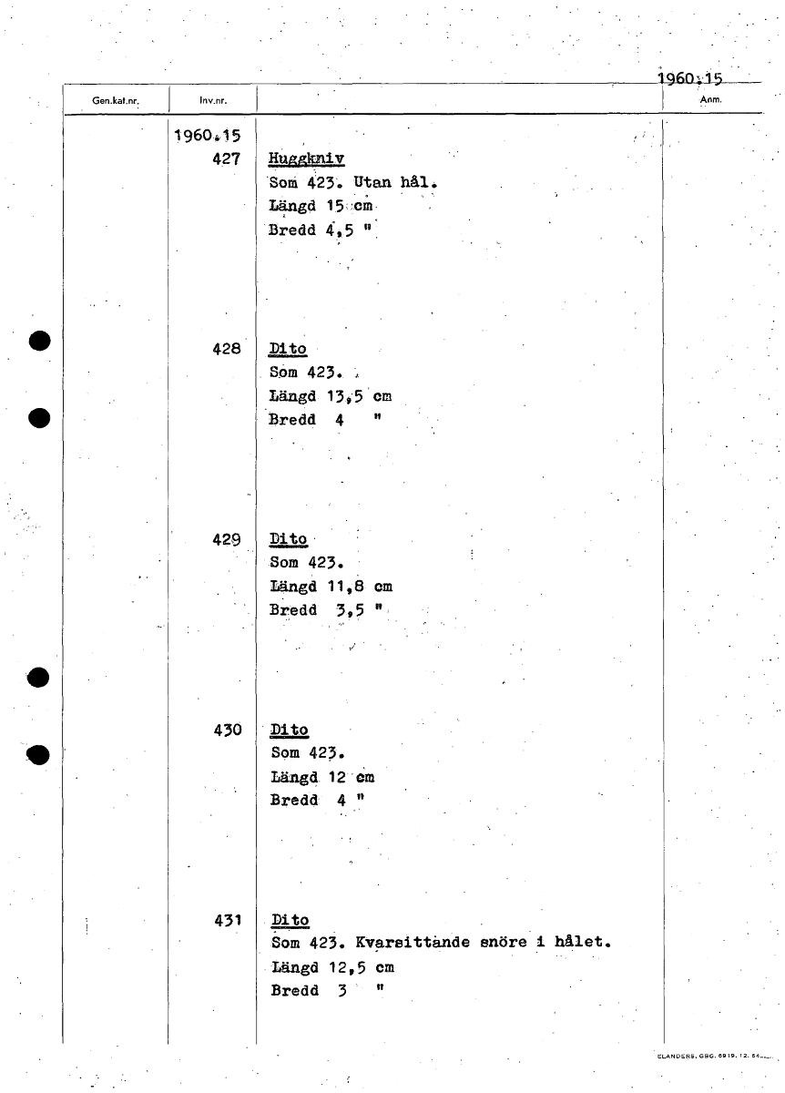 • 1960:15 1960:15 427 Huggkniv 'Uni 423. Utan hål. Längd 11.5::61 Bredd 4,5 "' 428 Dito Som 423. Längd 13,5 om Bredd 4 " 429 Dito Som 423. Längd 11 8 om Bi".edd 3,5 430 Dito Som 423. Längd 12 cm Bredd 4... Visa hela