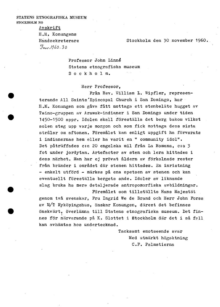 STATENS ETNOGRAFISKA MUSEUM Avskrift H.M. Konungens Handsekreterare Stockholm den 30 november 1960.. g-w.gtO 3 0 Professor John Linné Statens etnografiska museum Sockholm. Herr Professor, Från Rev. William L. Wipfler, representerande All Saints'Episcopal Church i San Domingo, har H.M. Konungen som gåve fått mottaga ett stenbeläte hugget av Taino-gruppen av Arawak-indianer i San Domingo under tiden...