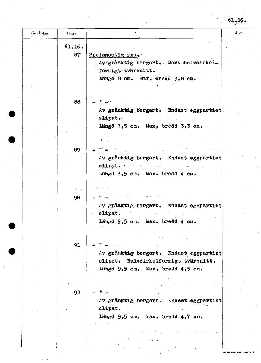 61.16, 61.16. 87' Spetånackig Yxa**. Av'sråaktig bergart. Mera halvoirkel- fsrmigt tvärsnitt. Längd 8,sm., Max. bredd 398 om. 88- Av'gråaktig:bergart., Endast eggpartiet slipat.' Längd' 7,5-cm. Ma,r. ...
