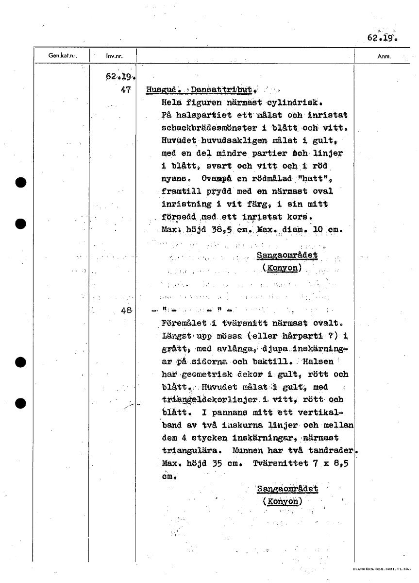 82019,4 47 .1119£21262.1äättniklaitv Hela figuren närmast .cylindrisk. På halspartiet ett målat och inristat sohaokbrädeemönster i blått ,00h, vitt. Huvudet huvudsakligen i gult, med en del mindre partier tch linjer i blått, svart och vitt och i röd nyans. Ovanpå en rödmålad' "hott", framtill prydd med en närmast oval inristning 1 vit Färg, i sin mitt förpedd ,med ett inristat kors. Maxi höjd 3895 om. ,Max diaM. 19 cm. Sangaområdet ( Kony on) 48 Pöremålet 1 tvärsnitt närmast ovalt. Längst' upp mössa ('eller hårparti ?) i grått, .med avlånga,-djupwinekärning- ar ,pA sidorna och baktill. Halsen' har geometrisk dekor i gult, rött och blått .Huvudet målat gult, med tti4Seldekorlinjer.i: vitt, rött och blått. 1 pannane mitt ett vertikal- band av två inskurna linjer, och mellan dem 4 stycken inskärningar,märmast triangulära. Munnen har två tandrader Max, höjd 35 cm. Tvärsnittet 7x 8,5 cm Sångåområdet (Korayon) • [ocr]
