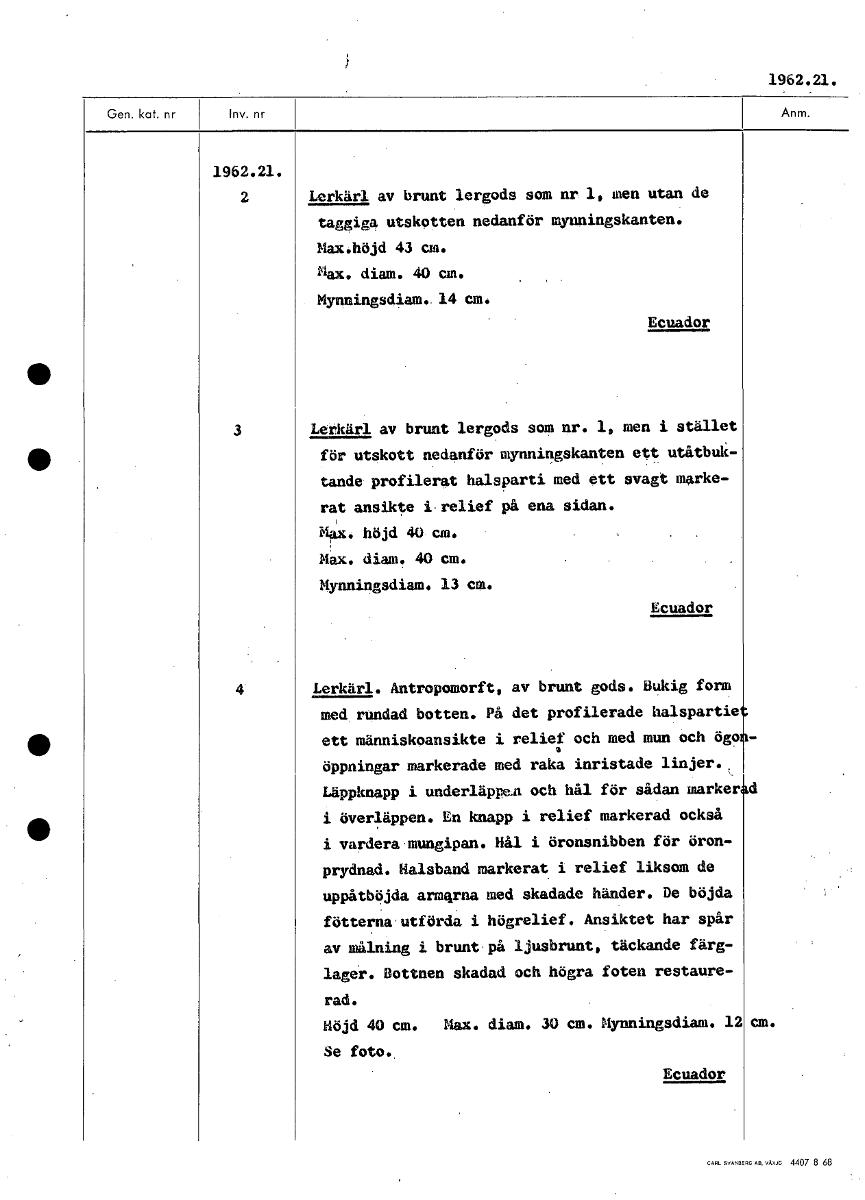 1962.21. 1962.21. 2 Lerkärl av brunt lergods som nr 1, men utan de taggiga utskotten nedanför mynningskanten. Max.höjd 43 cm. Max. diam. 40 cm. Mynningsdiam. 14 cm. Ecuador 3 Lerkärl av brunt lergods ...Visa hela