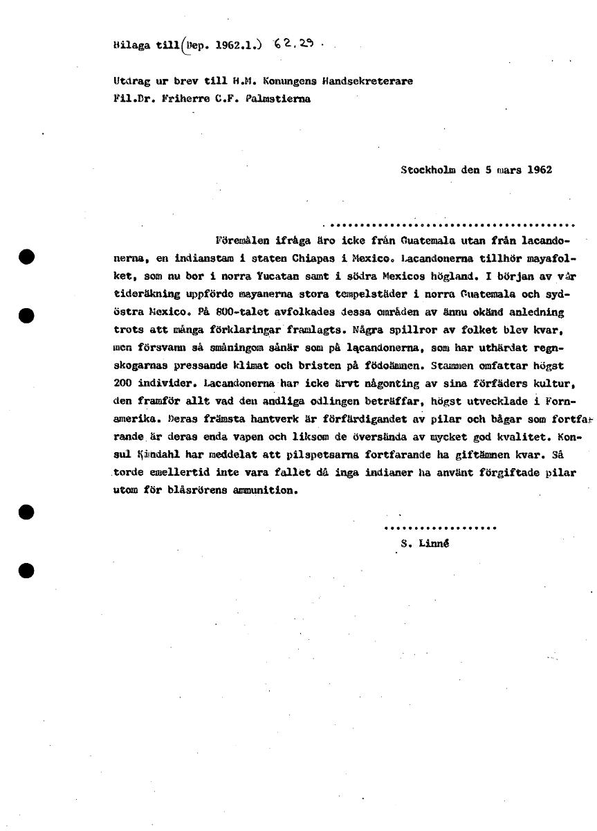 • liilaga till (1_ep . 1962.1 å 62, 29 Utdrag ur brev till H.M. Konungens Handsekreterare Fil.Dr. Friherre C.F. Palmstierna Stockholm den 5 mars 1962 Föremålen ifråga äro icke från Guatemala utan från l... Visa hela