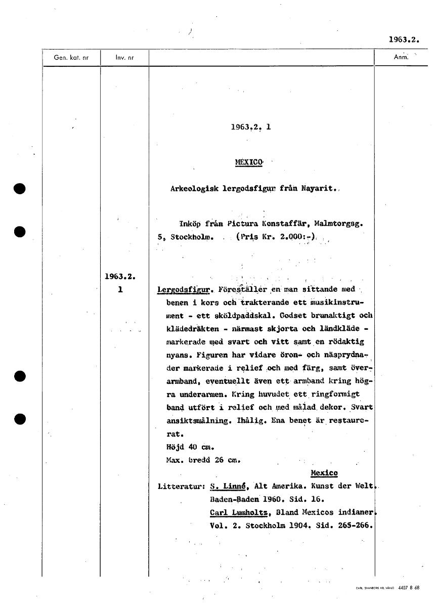 • 1963.2. 1963.2. 1 MEXICO, • Arkeologisk lergodsfigur från Nayarit... Inköp från Pictura Konstaffär, Malmtorgsg. 5, Stockholm. (Pris Kr. 2.000:-. 1963.2. 1 Lergodsfihur. Föreitäller en: man sittande me... Visa hela