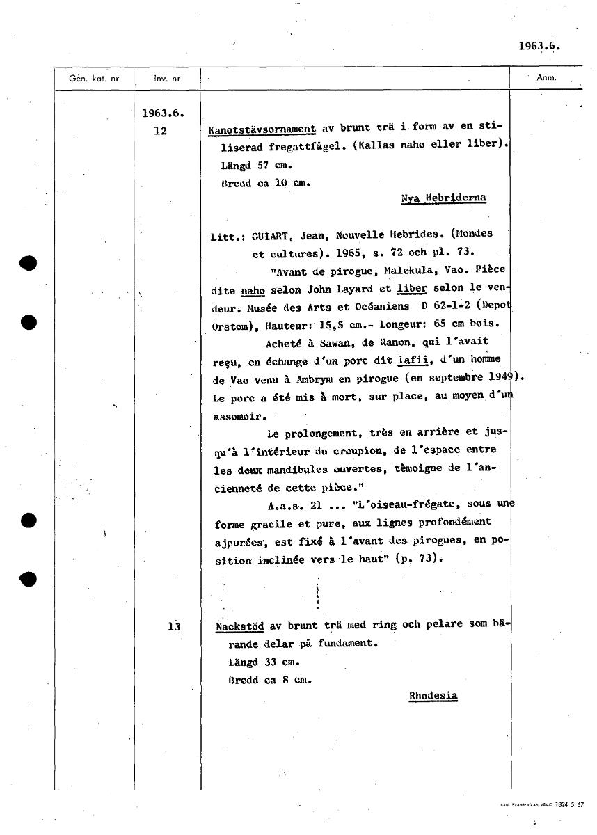1963.6. 1963.6. 12 Kanotstävsornament av brunt trä i form av en sti- liserad fregattfågel. (Kallas naho eller liber). Längd 57 cm. Bredd ca 10 cm. Nya Hebriderna Litt.: GUIART, Jean, Nouvelle Hebrides. (blondes et cultures). 1965, s. 72 och pi. 73. "Avant de pirogue, Malekula, Vao. Pikce dite nabo selon John Layard et liber selon le ven deur. Musée des Arts et Ocdaniens D 62-1-2 (Depo Orstom), Hauteur: 15,5 cm.- Longeur: 65 cm bois. Achetd å Sawan, de Ranon, qui l'avait regu, en dchange d'un porc dit lafii, d'un homme de Vao venu å Ambrym en pirogue (en septembre 194 Le porc a dtd mis å mort, sur place, au moyen d'u assomoir. Le prolongement, trks en arribre et jus- qu'å l'intdrieur du croupion, de l'espace entre les deux mandibules ouvertes, tbmoigne de l'an- ciennetd de cette pihce." A.a.s. 21 ... "L'oiseau-frdgate, sous un forme gracile et ;sure, aux lignes profonddment ajpurdes, est fixel å l'avant des pirogues, en po- sition,inclinde vers le haut" (p. 73). 13 Nackstöd av brunt trä med ring och pelare som bäm, rände delar på fundament. Längd 33 cm. Bredd ca 8 cm. Rhodesia [ocr]