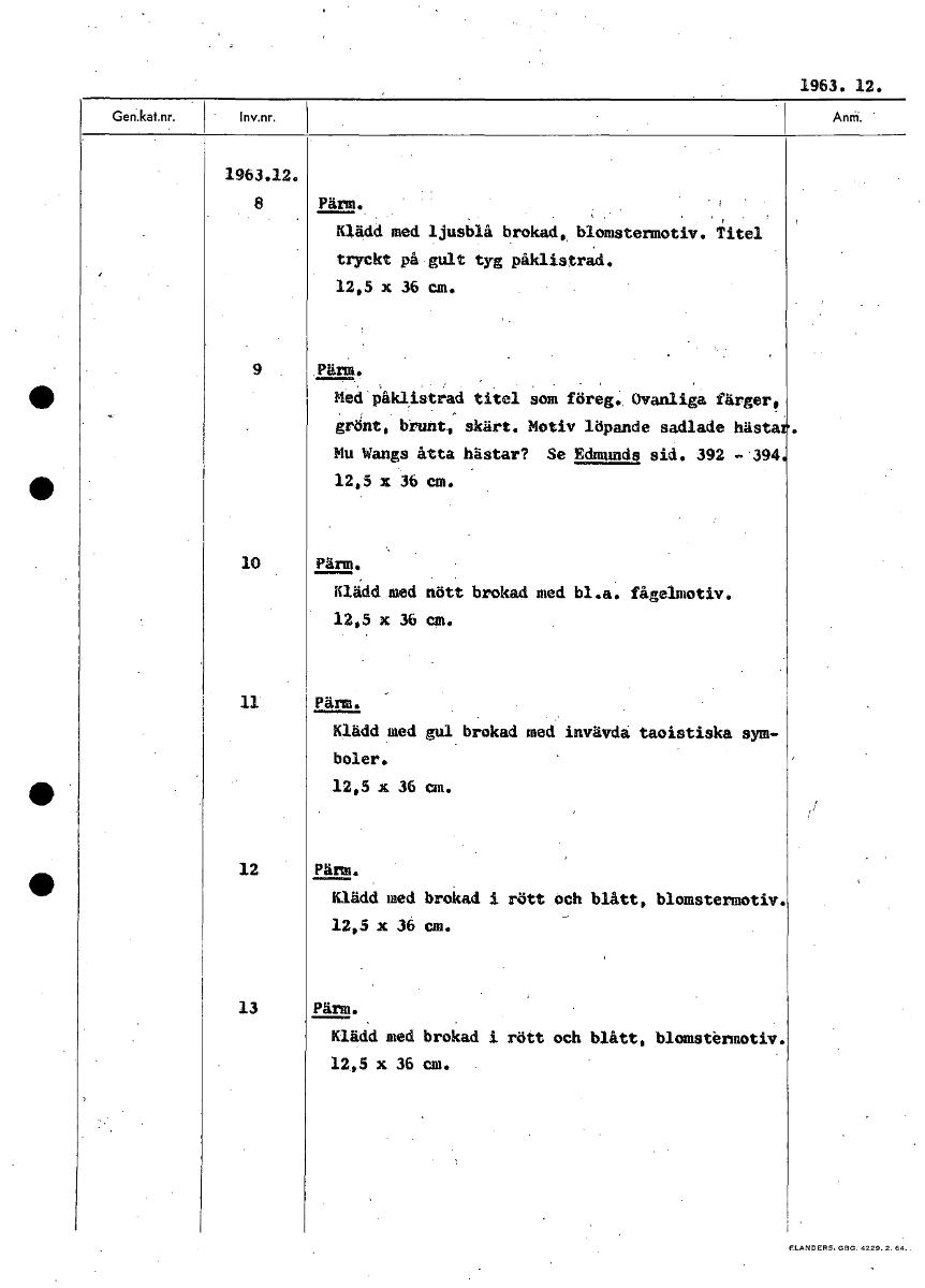 1963. 12. 1963.12. 8 Pärm. Klädd med ljusblå brokad., blomstermotiv. Titel tryckt på gult tyg påklistrad. 12,5 x 36 cm. 9 Pärm. Med påklistrad titel sam föreg. Ovanliga färger, grönt, brunt: skärt. Motiv löpande sadlade hästa Mu Wangs åtta hästar? Se Edmunds sid. 392 - 394 12,5 x 36 cm. 10 Pärm. Klädd med nött brokad med bl.a. fågelmotiv. 12,5 x 36 cm. 11 Pärm. Klädd med gul brokad med invävda taoistiska sym- boler. 12,5 x 36 cm. 12 Pärm. Klädd med brokad i rött och blått, blomstermotiv. 12.5 x 36 cm. 13 Pärm. Klädd med brokad i rött och blått, blomstörmotiv. 12,5 x 36 cm. [ocr]