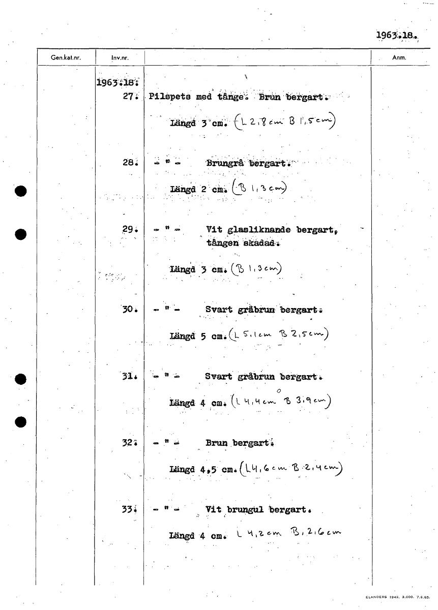 • 1965;la. 1963'4386.. 27: Pilspets med tånge.' Brån bergart.. r länåå -2 e 3 - 'I3'rung. bSrg längd 2 -cm. sc-w) — Vit glasliknande bergart„ tången sis.aelad. längd 3 cm: e% .3c1"^) 30 Svart gråbrun be... Visa hela