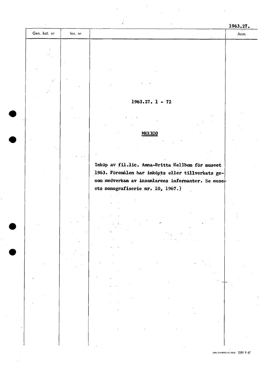 • 1963.27. 1963.2?. 1 - 72 MEXICO Inköp av fil.lic. Anna-Britta Bellbom för museet 1963. Föremålen har inköpts eller tillverkats ge- nom medverkan av insamlarens informanter. Se muse ets monografiserie ... Visa hela