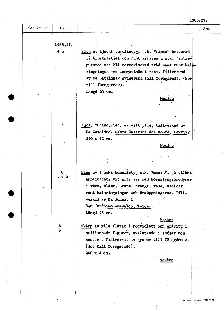 ,1963.27. 1963.27. 4 b Blus av tjockt bomullstyg, s.k. "måsta" broderad på bröstpartiet och runt ärmarna i s.k. "sobre- puesto" med blå merceriserad tråd samt runt hal ringningen med langettsöm i rött. Tillverkad av 1)a Catalina? svägerska till föregående. (Hör till föregående). Längd 65 cm. Mexico 5 Kjol, "Chincuete", av vitt ylle, tillverkad av Da Catalina. Santa Catarinå del Monte, TexcPÅ 240 x 72 cm. Mexico 6 Blus av tjockt bomullstyg s.k. "manta", på vilket a - b applicerats vit gles väv med korsstyngsbrodyrer i rött, blått, brunt, orange, rosa, violett runt halsringningen och ärmöppningarna. Till- verkad av Da Juana, i San Jerdnimo Amanalco, Textteo Längd 48 cm. Mexico 6 Skärp av ylle flätat i rödviolett och gråvitt i b stiliserade figurer, avslutande i tofsar och snodd.er. Tillverkat av syster till föregående. (Hör till föregående). 260 x 5 cm. Mexico [ocr]