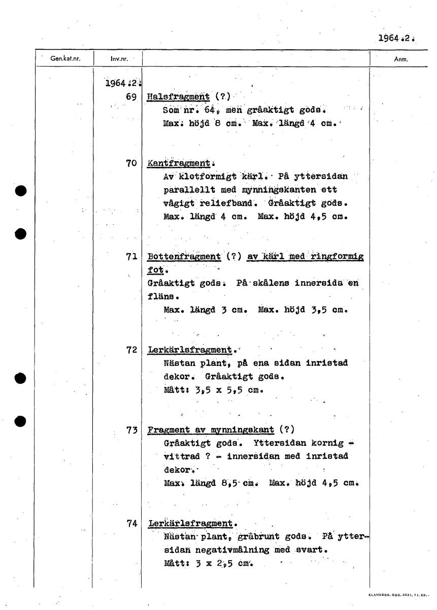 1964424 1964:24 69 Halefragmeht (?) 649migr4éJctigt göds. Max: höjd '8 cm.' Mak,aängd'4 cm. 70 Kan fragment AVklotforMigt 'kärl.° På yttersidan, parallellt med mynningskanten ett vågigt reliefband. Gr...