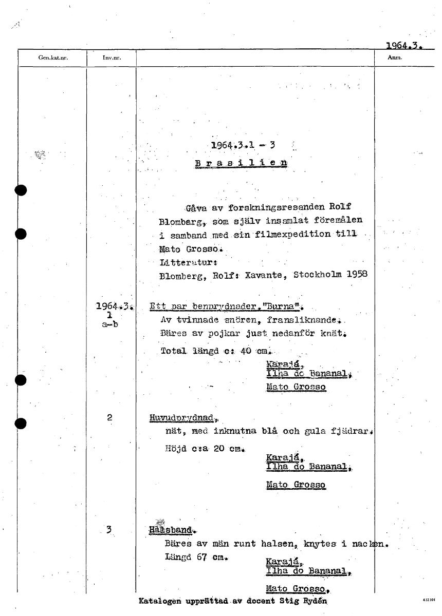 1964.3. 1964,3.1 — 3 • Brasilien GåVa-av forskningsresanden Rolf Blomberg, sömsjälv insamlat föremålen • 1 samband .md.sin'fiIinel6Dedition•till, .Mato:Gross-6.. • Litteratur: • • Blomberg, Xavante, S...
