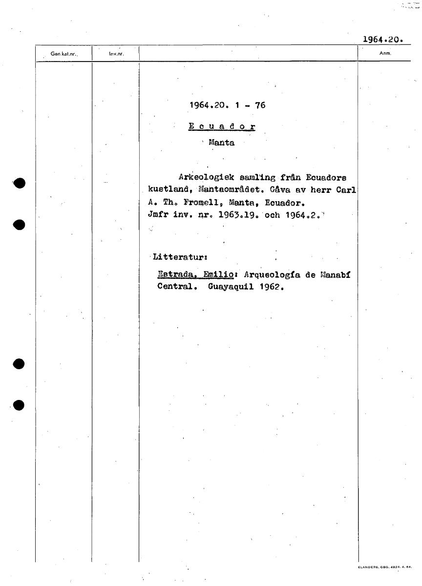 1964.20. 1964.20. 1 - 76 Ecuador Manta Arkeologisk samling frän Ecuadors kustland, Mantaområdet. Gåva av herr Carl A. Th, Fromell, Manta, Ecuador. Jmfr inv. nr. 1963.19. och 1964.2.' Litteratur: Eetra...