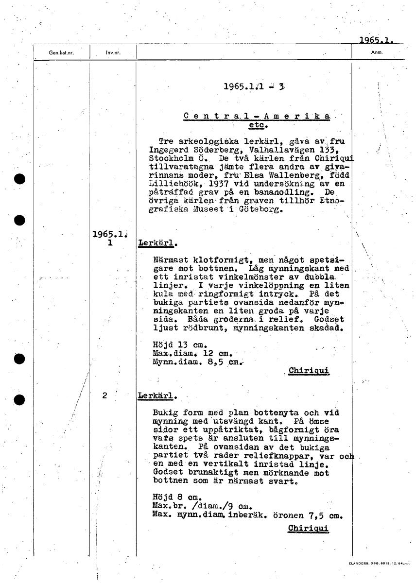 • 1965.1. 1965.1:1 •=1 3 Centra_l -Amerik a, etc. Tre arkeologiska lerkärl, gåva av,fru Ingegerd Söderberg, Valhallavägen 133, Stockholm Ö. De två kärlen från Chiriq, tillvaratagna jämte flera andra av ... Visa hela