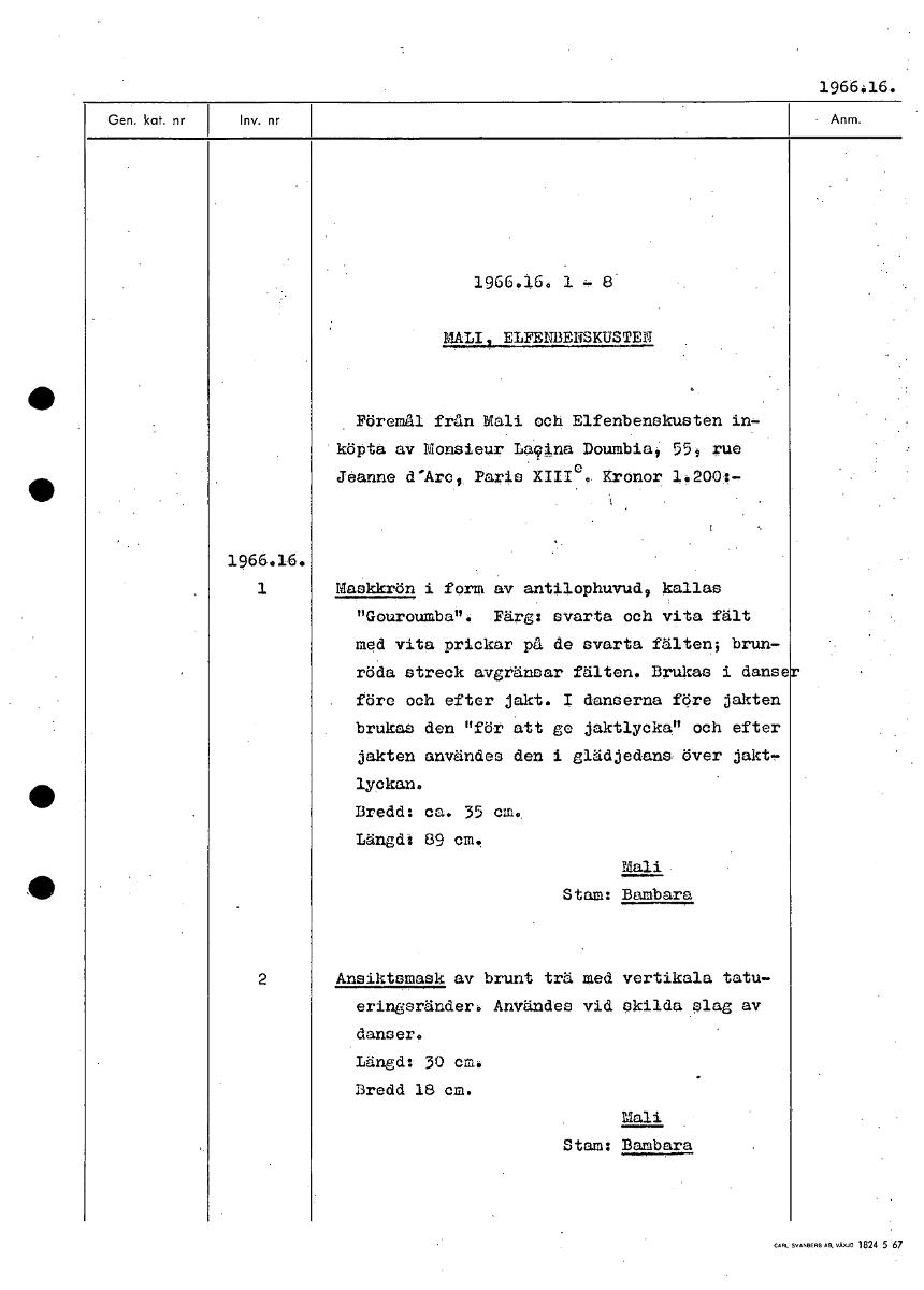 1966.16. 1966.16, 1 8 MALI ELFENBENSKUSTEN Föremål från Mali och Elfenbenskusten in- köpta av Monsieur La9ina Doumbia; 55, rue Jeanne d'Arc, Paris XIIIoo. Kronor 1.200:- 1966.16. 1 Maskkrön i form av ...