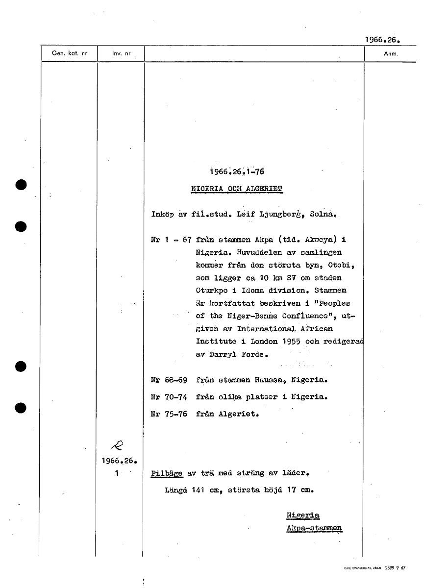 1966.26. 1966.26'0146 1966.26'0146NIGERIA OCH ALGERIET Inköp av fii.stud. Leif Ljungber4 Solnå. • Nr 1 - 67 från stammen Akpa (tid. Akweya) i Nigeria. Huvuddelen av samlingen kommer från den största b...Visa hela