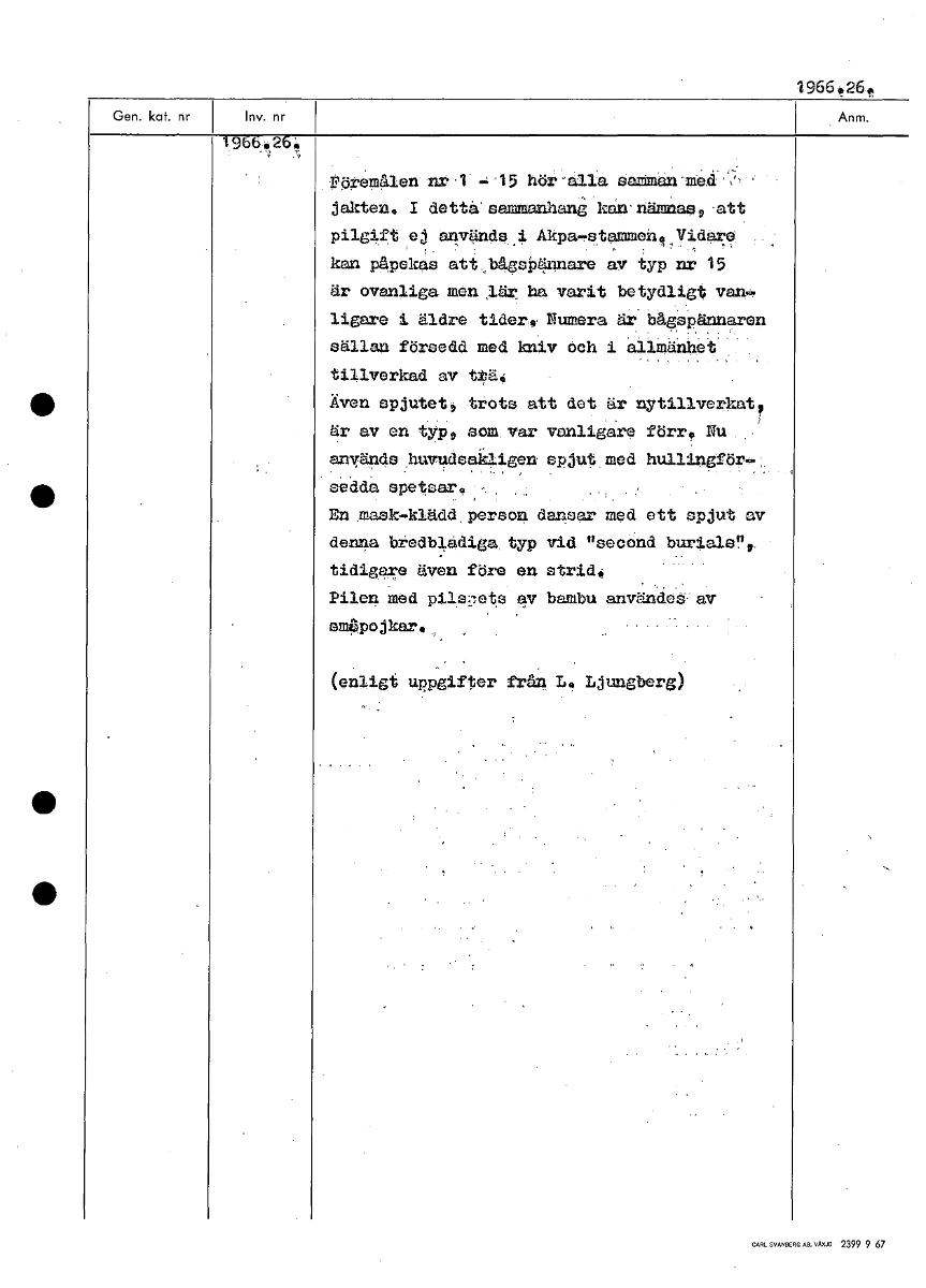 1966,26e 196426. Föremålen nr .1 ='15 hör allasaanan'ineci `'» jakten, I detta sammanhan kan nämnas,-att pilgift ej används .1 Akpa-stammeh,Vidare kan påpekas att.bågsP4nnare av typ nr 15 är ovanliga ...