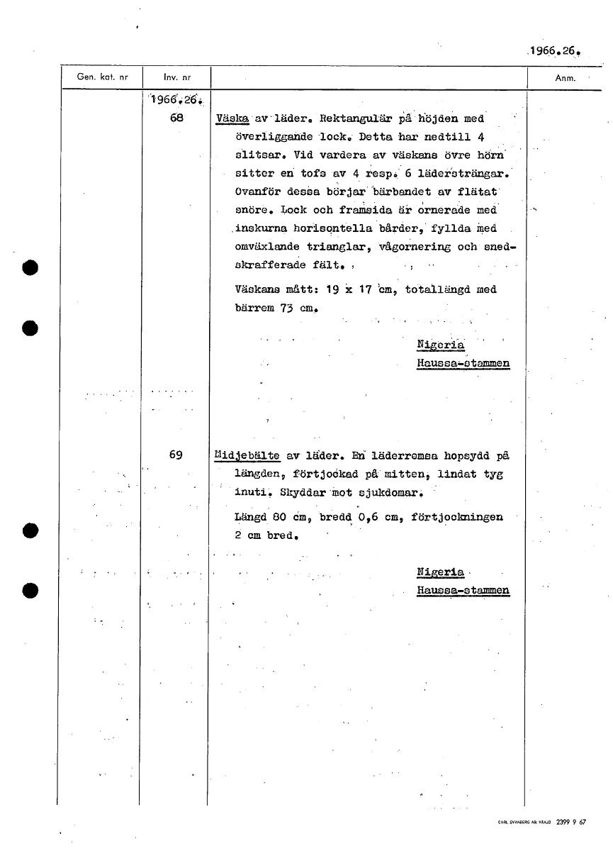 ,1966.26. '1966:26: 68 Väska av läder. Rektangulär på höjden med överliggande lock, Detta har nedtill 4 slitsar, Vid vardera av väskans övre hörn sitter en tofs av 4 resp, 6 lädersträngar. Ovanför dessa börjar bärbandet av flätat snöre. Lock och framsida är örnerade med inskurna horisontella bårder, fyllda med omväxlande trianglar, vågornering och sned- skrafferade fält. , Väskans mått: 19 x 17 'cm, totallängd med bärrem 73 cm. Nieria Haussaotammen 69 Midjebälte av låder. En' läderremsa hopsydd på längden, förtjoCkad på mitten, lindat tyg inuti. Skyddarmot sjukdomar. Längd 80 Cm, bredd 0,6 cm, förtjockningen 2 cm bred. Nigeria Haussa-stammen [ocr]