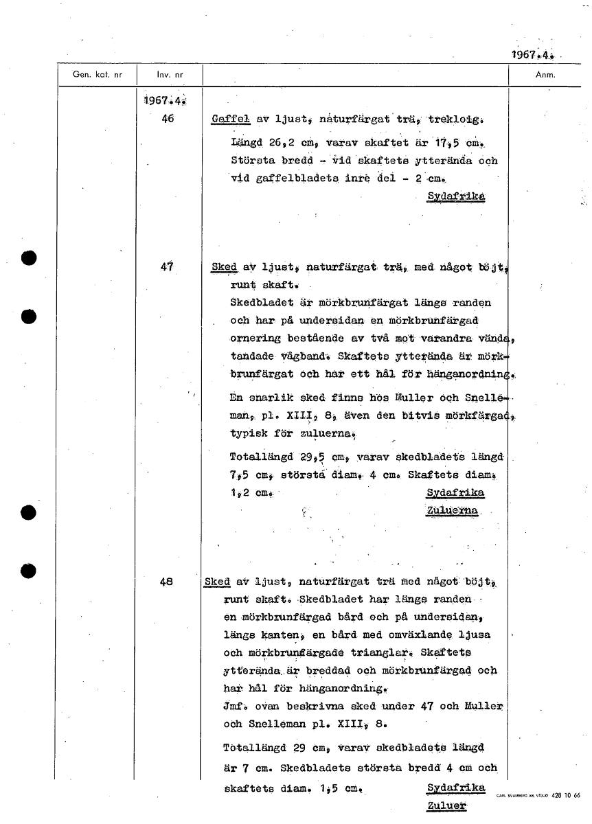• 1967. 4; 19e7;k4• 46. Gaffel av ljust, nåturfårgafträ9-trekloigh Längd 26,2 ena, varav skaftet är 165 cit Största bredd - Vid skaftetå ytterända och vid gaffelbladets inre del - Sydafrika 47 Sked av l... Visa hela