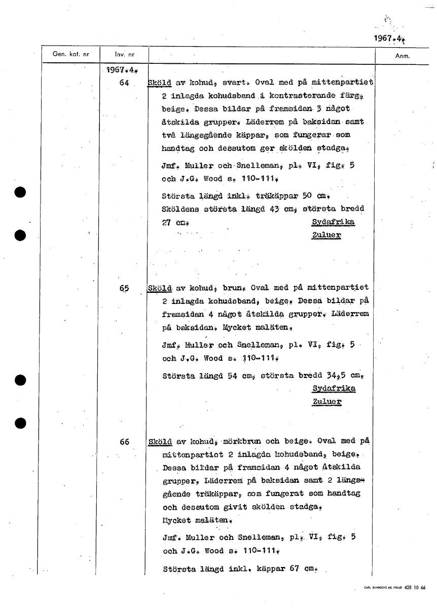 1967.4,. 1967#41, 64H sköld av kohud9 svart. Oval med på mittenpartiet 2 inlagda kohudsband i kontrasterande färg9 beige, Dessa bildar på framsidan 3 något åtskilda grupper. Läderrem på baksidan samt två längsgående käppars, som fungerar som handtag och dessutom ger skölden stadga, Jmf. Muller och-Snel1eman9 pl. VID fig. 5 och J.G. Wood s. 110-111, Största längd inkl. träkäppar 50 an, Sköldens största längd 43 cm, största bredd 27 cmo Sydafrika Zuluer 65 Sköld av kohud9 brun? Oval med på mittenpartiet 2 inlagda kohudeband9 beige.. Dessa bildar på framsidan 4 något åtskilda grupper? Läderram på baksidan. Mycket maläten, 'och. Sue4emano pi. 1719 flat och J.G. Wood s. 110-1114 Största längd 54 cm§ största bredd 34,5 cm4, Sydafrika Zuluer 66 Sköld av kohud9 mörkbrun och beige. Oval med På mittenpartiet 2 inlagda 1rohndsband9 beige* Dessa bildar på framsidan 4 något Atskilda grupper. Läderrem på baksidan samt 2 längs- gående träkäppar som fungerat som handtag och dessutom givit skölden stadga? Mycket maläten* Jmf. Muller och Snelleman9 VI9 fig. 5 och J.G. Wood s. 110-111, Största längd inkl. käppar 67 cm. [ocr]