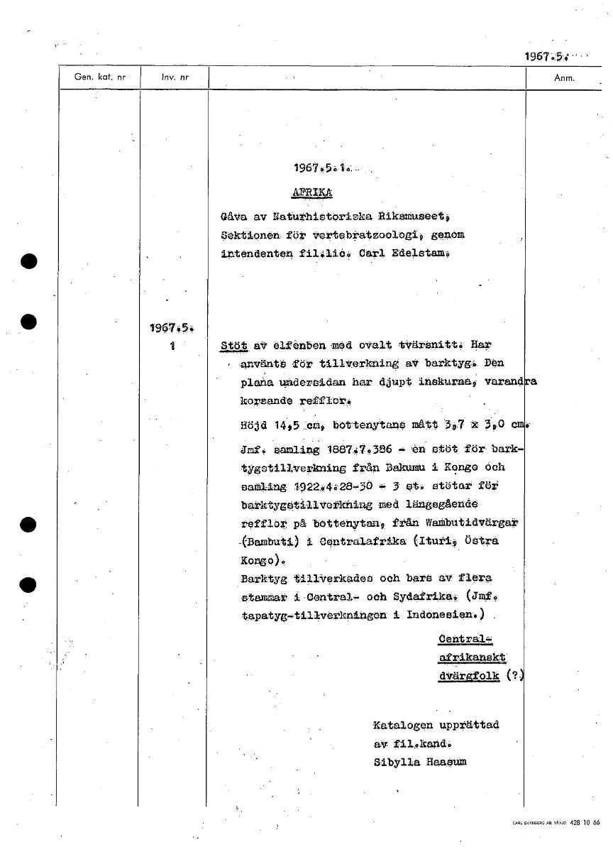 1967.3.1., . APRIKA GAVa av Naturhistoriska Rikamuseet, Sektionen för vertebratzoologi, genom intendenten fil.lic- Carl Edelstam. 1967.5.1 Stöt elfenben -med ovalt tvärsnitt. . Har använts för tillverkning av barktyg Den Plana Undersidan har djupt inskurna varand a korsande refflerk Höjd 140,enp bottenytans mått 34,7 x 3'90 Jmf. tunmling 188747+386 -4. ön stöt för bark- tygstillVerkning från Bakterm u 1 Kx?ngo och aatling 1922..4428-30 - 3' ste stötar för barktygatillverkning med längsgående refflor på bettenytan9 från Wanbutidvärgat CSambuti) i Oentralafrika (Iturii, östra Kongo). Barktyg tillVerkades och bars av flera stammat i Central- ooh SYdafrika. (jnf. tapatyg -tillverkningen i Indonesien.) Central afrikanskt' dvärAfelk (? Katalogen upprättad av fil.kand. Sibylla Haa0Um [ocr]