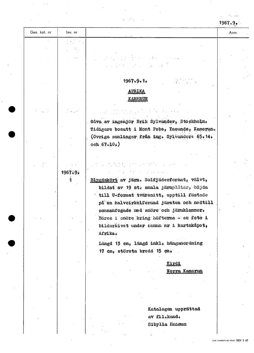 19697,. ,1! • Gåva av ingailJör Erik Sylvander, Stockholm. Tidigare bosatt i Mont Febe,Yaounde, Kamerun. (Övriga samliagar från ing. Sylvander 65.14. och 67.10) 1. Blygdskört av järn, solfjädersformat, välvt bildat av 19t+ smala järnplåtaro 'böJda 'till U-fermat tvärsnitt, upptill fästade .p 'On balveirkelfermad Järnten eeb nédtill eammanfogade med snöre och järaklammoro Bäres i snöre kring höfterna - se foto i bildarkivet under et>mwii9. nr i kartekapett Afrika. Längd 13 em, längd inkl! hängaaordning 17 cm y största bredd 15 cm. Kirdi Norra :Kamerun Katalogen upprättad av fil. ande Sibylla Waäum [ocr]