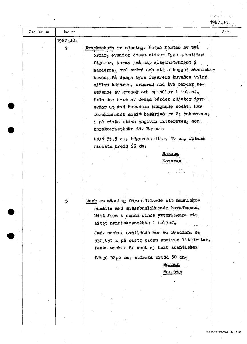 19670, 10 1967.100 4 Ilapkeshorn av mässi Foton formad av, två ormar Ovanför deosa sitter fyra människoa» figurer varav tv 4 har slaginstramemt händerna9 två svärd och ett avtngget människ huvudb På dessa syra figurers huvuden vilar, själva bägaren9, ornerad med två bårder be — etående av grodor oah SPindlar i relief, Frän den övre av dessa bårder.skiuter. fyra ormar ut mod huvudena hängande nedåt., Hår förekommande motiv beskrivs av B4 Ankermann9 i på sista sidan angiven litteratur9 som karakteristiska rör Bemoum. Höjd 3595 ah. bägarens diamii: 15 au fotens största bredd 25 aM4. Batoum KatierUn 5 Mask av mässing föreställande ett nännisko ansikte med anturbanliknande huvudbonad. blitt fram i donna finns Ytterligare ett litet människoansikte i rellefi; Jat masker avbildade hes Buschan9 532,.533 i på sista sidan angiven litterature Dessa masker är dock ej helt identiskak Längd 3295 am9 •största bredd 30 om Bamoum Kamerun [ocr]
