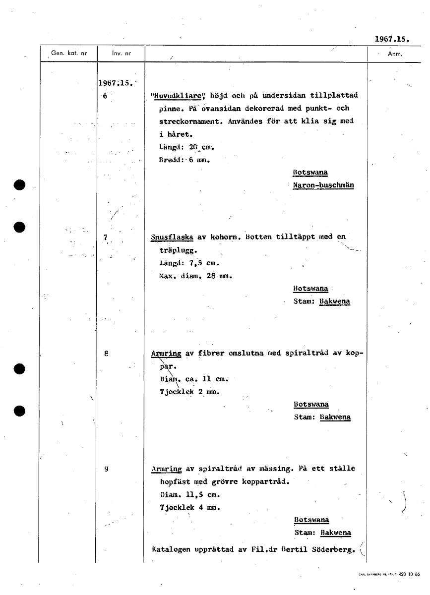 1967.15. 1967:15.' "Buvudkliarg böjd och på undersidan tillplattad pinne. På ovansidan dekorerad med punkt- och streckornament. Användes för att klia sig med i håret. Längd: 20 cm. Bredd:-b mm. Botswana Naron-buschmän Snusflaska av kohorn. Botten tilltäppt med en träplugg. Längd: 7,5 cm. Max. diam. 28 mm. Botswana Stam: Bakwena 8 Ax ring av fibrer omslutna med spiraltråd av kop- par. Diam. ca. 11 cm. Tjocklek 2 mm. Botswana Stam: Bakwena 9 Armring av spiraltråd av mässing. På ett ställe hopfäst med grövre koppartråd. Diam. 11,5 cm. Tjocklek 4 mm. Botswana Stam: Bakwena Katalogen upprättad av Fil.dr Bertil Söderberg. k, [ocr]Stäng