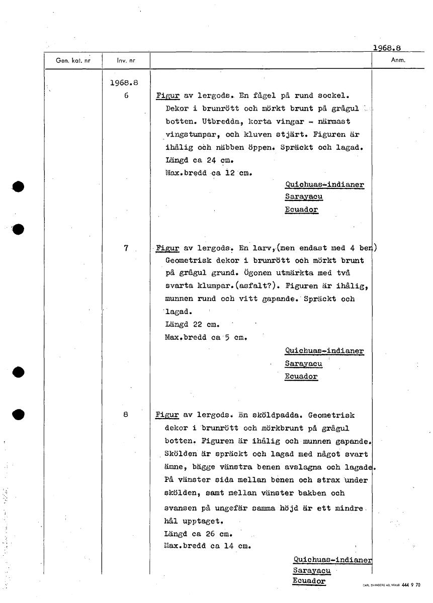 1968.8 1968.8 6 Figur av lergods.. En fågel på rund sockel. Dekor i brunrött och mörkt brunt på grågul botten. Utbredda, korta vingar - närmast vingstumpar, och kluven stjärt. Figuren är ihålig och näbben öppen. Spräckt och lagad. Längd ca 24 cm. Max.bredd ca 12 cm. Quichuas-indianer Sarayacu Ecuador 7 Figur av lergods. En larv, (men endast med 4 be Geometrisk dekor i brunrött och mörkt brunt på grågul grund. Ögonen utmärkta med två svarta klumpar.(asfalt?). Figuren är ihålig, munnen rund och vitt gapande. Spräckt och 'lagad. Längd 22 cm. Max.bredd ca 5 cm. Quichuas-indianer Sarayacu Ecuador 8 Figur av lergods. En sköldpadda. Geometrisk dekor i brunrött och mörkbrunt på grågul botten. Figuren är ihålig och munnen gapande. Skölden är spräckt och lagad med något svart ämne, bägge vänstra benen avslagna och lagad. På vänster sida mellan benen och strax under skölden, samt mellan vänster bakben och svansen på ungefär sPnima höjd är ett mindre hål upptaget. Längd ca 26 cm. Max.bredd ca 14 cm. Quichuasindiane Sarayacu Ecuador [ocr]Stäng