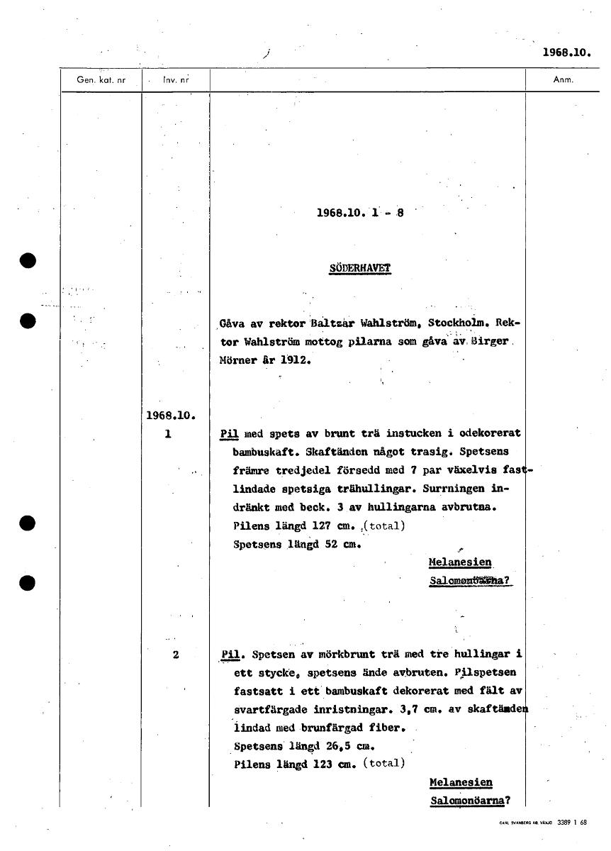 1968.10. 1968.10. l' SÖDERHAVET ,0åva av rektor Halvår Wahlström, Stockholm. Rek- tor Wahlström mottog pilarna som gåvaa4,Birger. Mörner år 1912. 1968.10. 1 Pil med spets av brunt trä instucken i odek...