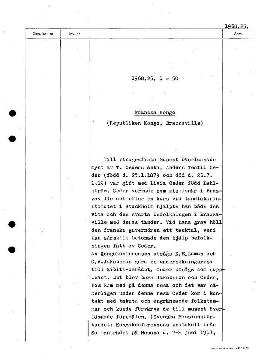 • 1968.25.. 1968.25, 1 50 Franska Kongo (Republiken Kongo, Brazzaville) Till Etnografiska Museet överlämnade mynt av T. Ceders änka. Anders Teofil Ce- der (född d. 25.1.1379 och död d. 26.7.. 1919) var ... Visa hela