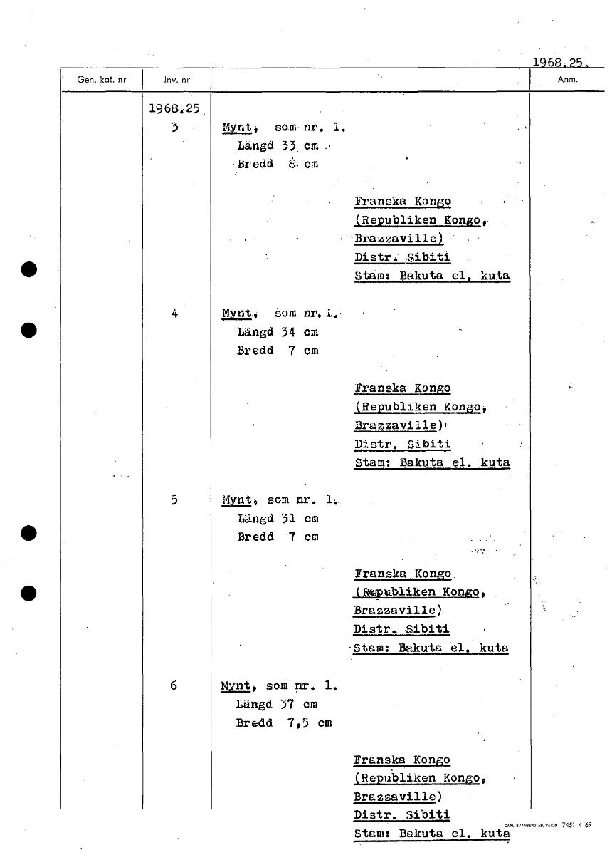 1968..25. 1968425,, 3. Mynt, som nr, 1. Längd 33 cm .. Bredd å'. cm Franska Kongo (Republiken Kongo, Brazzaville) . Distr. Sibiti Stam: Bakuta el. kuta 4 Mynt., som nr. 1. Längd 34 cm Bredd 7 cm Franska Kongo (Republiken Kongo, Brazzaville), Distr. Sibiti Stam: Bakuta el. kuta 5 Mynt, som nr. Längd 31 cm Bredd 7 cm Franska Kongo (Rwpubliken Kongo, Brazzaville) Distr. Sibiti Stam: Bakuta 'el. kuta 6 Mynt, som nr. 1. Längd 37 cm Bredd 7,5 cm Franska Kongo PRepubliken Kongo, Brazzaville) Distr, Sibiti Stam: Bakuta el. kuta [ocr]
