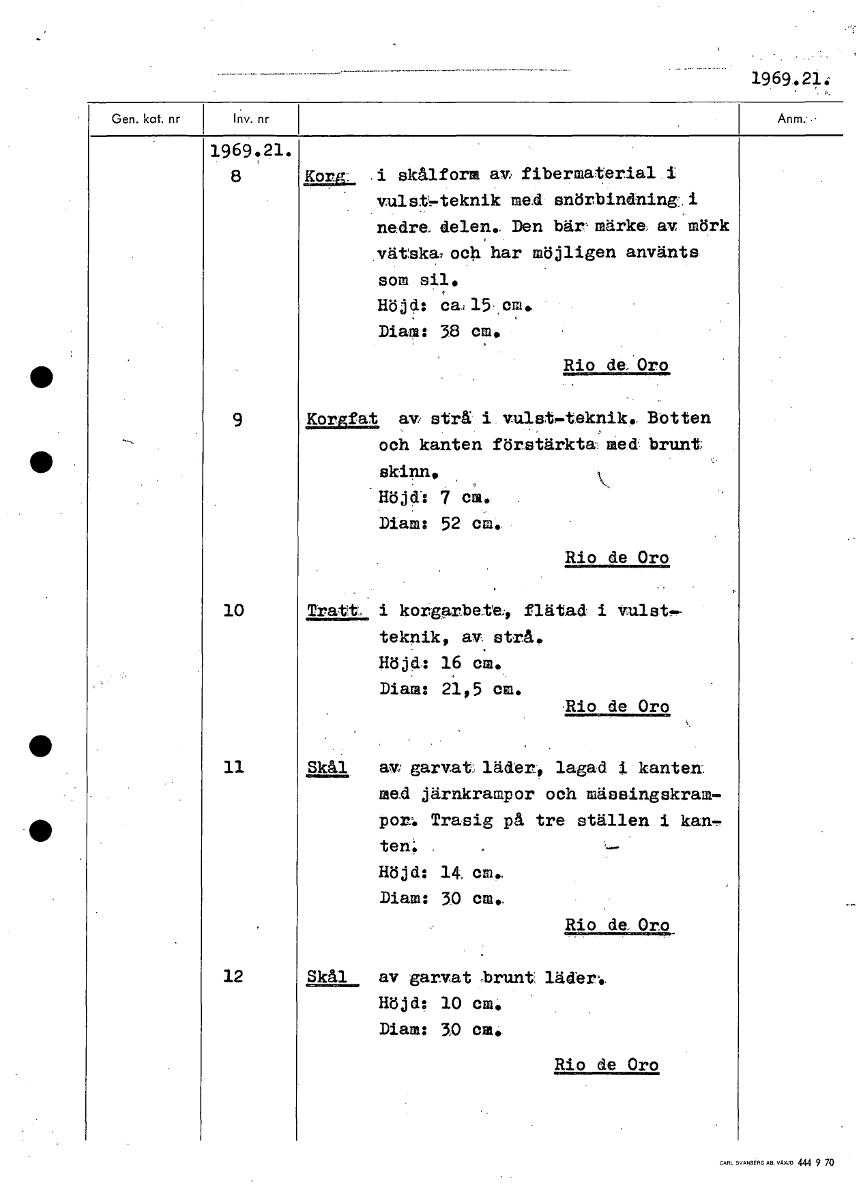 1969.214 1969.21. 8 Korg i skålform av fibermaterial i vulst-teknik med snörbindning i nedre. delen. Den bär märke av mörk vätska,och har möjligen använts som sil. Höjd: Ca, 15 em. Diam: 38 em, Rio de. Oro 9 Korgfat av strå i vulst-teknik., Botten och kanten förstärkta med brunt skinn, Höjd:: 7 em. Diam: 52 cm. Rio de Oro 10 TrattL i korgarbete;, flätad i Vulst,- teknik, av strå. Höjd: 16 cm. Diam: 21,5 cm. Rio de Oro 11 Skål av garvat; läder, lagad i kanten: mad järnkrampor och mässingskram- por% Trasig på tre ställen i kan, ten; . Höjd: 14, cm. Diam: 30 cm. Rio da Oro 12 Skål av garvat Irunt Höjd: 10 cm. Diam: 50 cm. Rio de Oro [ocr]