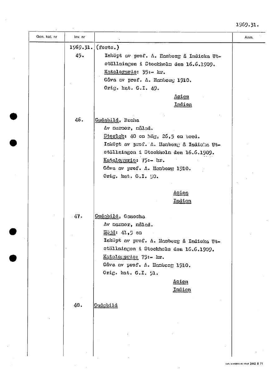 196931 1969.31. (forts.) 45. InkÖpt v prof. A. Hamberg aIndieka Ut. ottIllnineet i Stockholm den 16.61909, 1491p2pri.3: 35;. 4,Y2. Gåva av prof, A. Hambore 1910. Orig. kat. G.I. 49. Aeleal Indien 46. ...