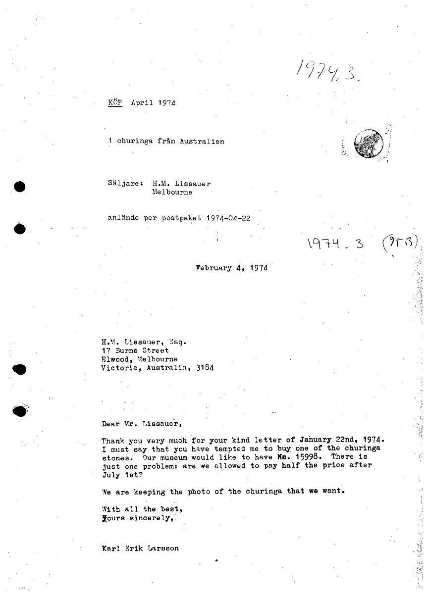 KÖP April 1974 1 churinga från Australien Säljare: H.M. Lissauer Melbourne anlände per postpaket 1974-04-22 \9-3Lt 3 5FM February 4, 1974 H.M. Lissauer, '2sq. 17 Burns Street Elwood, Melbourne Victoria, Australia, 3184 Dear Mr. Lissaue*r, Thank you very much for your kind letter of Jahuary 22nd, 1974. I must say that you have tempted me to buy one of the churinga stones. Our museum would like to have Mo. 15998. There is just one problem: are we allowed to pay half the price after July Ist? We are keeping the photo of the churinga that we want. With all the best, Lours sincerely, Karl Erik Larsson [ocr]