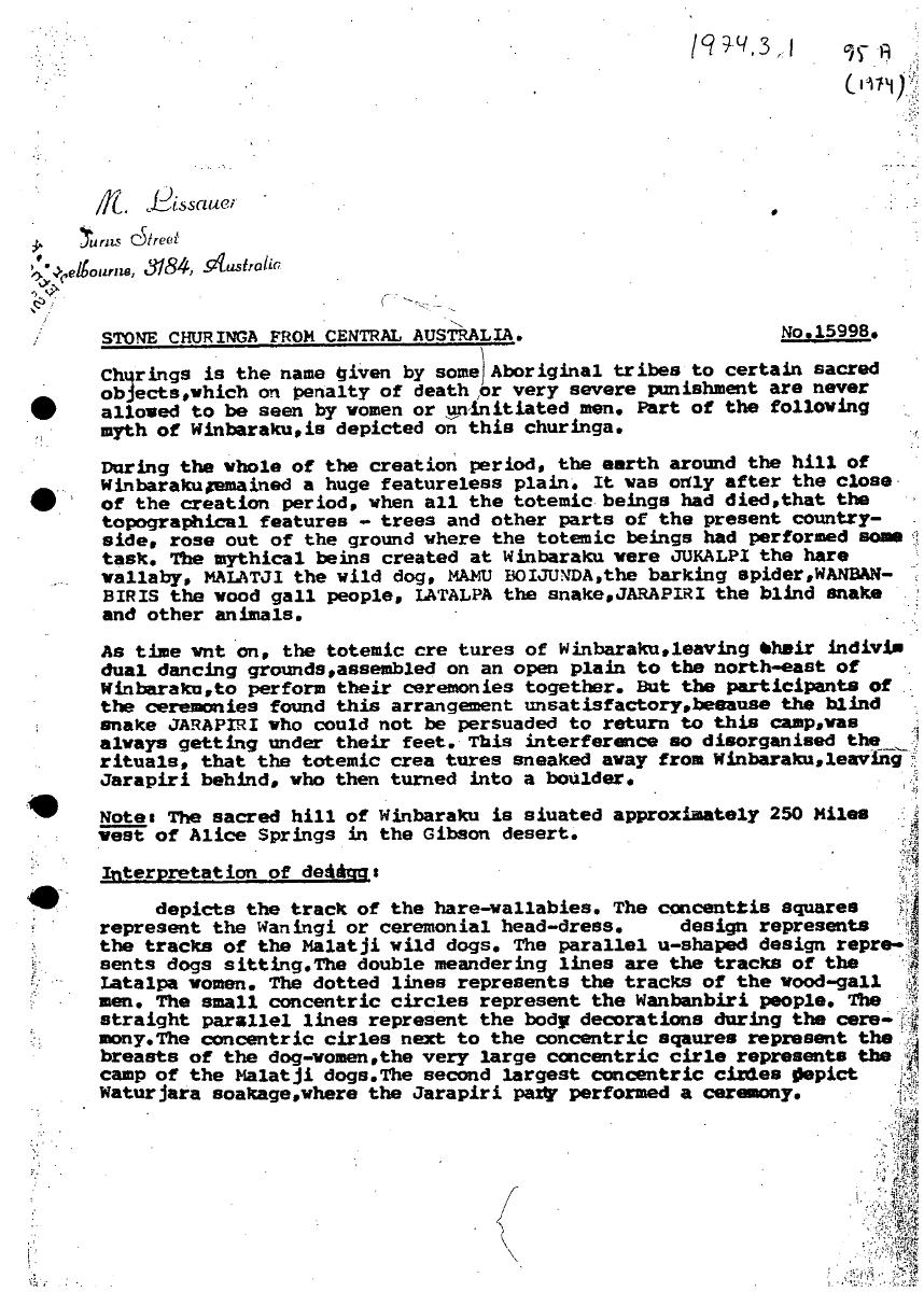 Churings is the name given by some Aboriginal tribes to certain sacred objects, which on penalty of death, or very severe punishment are never allowed to be seen by nomen or uninitiated men. Part of the following myth of Winbaraku, is depicted on this churinga. During the whole of the creation period, the earth around the hill of Winbaraku remained a huge featureless plain. It was orfly after the close of the creation period, when all the totemic beings had died, that the topographical features - trees and other parts of the present countryside, rose out of the ground where the totemic beings had performed some task. The mythical beings created at Winbaraku were JUKALPI the hare vallaby, MALATJI the wild dog, MAMU BOIJUNDA, the barking spider, WANBANBIRIS the wood gall people, LATALPA the snake, JARAPIRI the blind snake and other animals.
