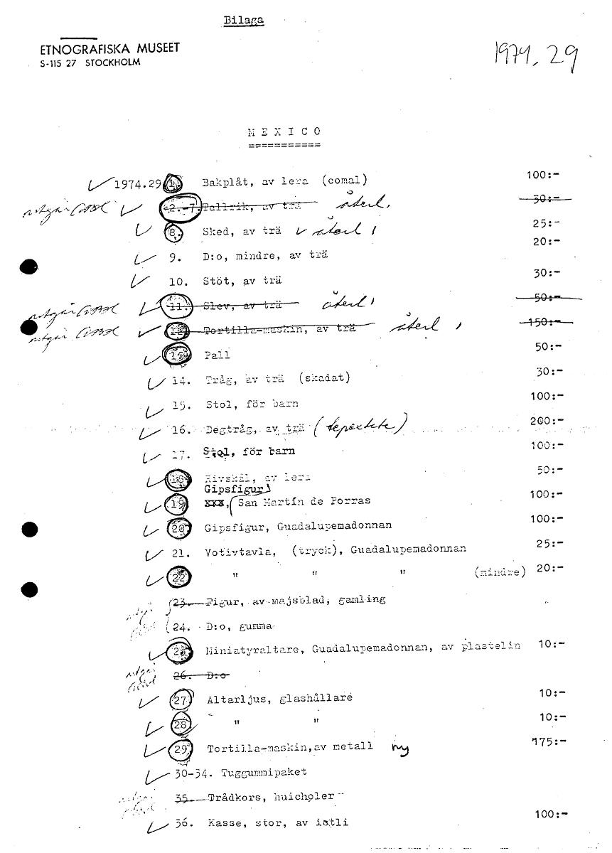 Biiara ETNOGRAFISKA MUSEET MEXICO 974.29 Bakplåt, av lera (comal) -1.3 30:- Sked, av trä i 25:- 25:-20:- 9. D:o, mindre, av trä 10. Stöt, av trä 30:- 50 150:- 50:- 14. UrftE, av t7-1 (skadat) 30:- 100:- _.. ,...:_:-: • (-47/2. cile.4,-/-c_-). 200:- för bara 100:- er, 5D:- Gipsfiuu0 NPM,pan Martin de Porras 100: Guadalupemadonnan 100:- L/- 21. Votivtavla, (tryck), Guadalupemadonnan 25:- (rlinclre) 20:- (23_ 2igur„av-majsblad, gamling J 24, D:o, Eumma- niniatyraltare, Guadaluremadonnan, av -1;lastelin 10t- 26. DI-tr Altarljus, clashållar6 10:- metall 175:- 3 9-34 . Tt 35 _-.Trådkors, huicholer-- Kasse, stor, av iali 100: [ocr]