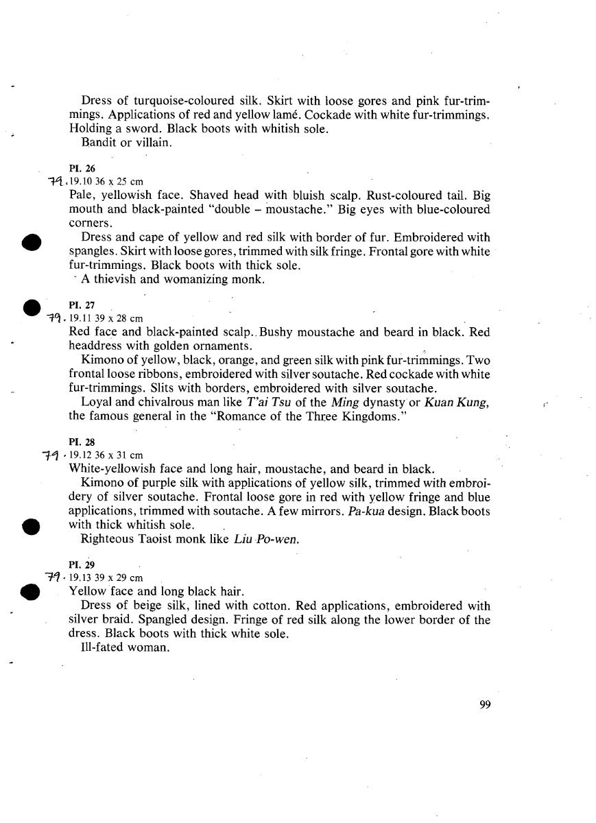 Dress of turquoise-coloured silk. Skirt with loose gores and pink fur-trim- mings. Applications of red and yellow lanA. Cockade with white fur-trimmings. Holding a sword. Black boots with whitish sole. Bandit or villain. Pale, yellowish face. Shaved head with bluish scalp. Rust-coloured tail. Big mouth and black-painted "double — moustache." Big eyes with blue-coloured corners. • Dress and cape of yellow and red silk with border of fur. Embroidered with spangles. Skirt with loose gores, trimmed with silk fringe. Frontal gore with white fur-trimmings. Black boots with thick sole. - A thievish and womanizing monk. 1-9 Red face and black-painted scalp.. Bushy moustache and beard in black. Red headdress with golden ornaments. Kimono of yellow, black, orange, and green silk with pink fur-trimmings. Two frontal loose ribbons, embroidered with silver soutache. Red cockade with white fur-trimmings. Slits with borders, embroidered with silver soutache. Loyal and chivalrous man like T'ai Tsu of the Ming dynasty or Kuan Kung, the famous general in the "Romance of the Three Kingdoms." White-yellowish face and long hair, moustache, and beard in black. Kimono of purple silk with applications of yellow silk, trimmed with embroi- dery of silver soutache. Frontal loose gore in red with yellow fringe and blue applications, trimmed with soutache. A few mirrors. Pa-kua design. Black boots • with thick whitish sole. Righteous Taoist monk like Liu Po-wen. • Yellow face and long black hair Dress of beige silk, lined with cotton. Red applications, embroidered with silver braid. Spangled design. Fringe of red silk along the lower border of the dress. Black boots with thick white sole. Ill-fated woman. 99 [ocr]