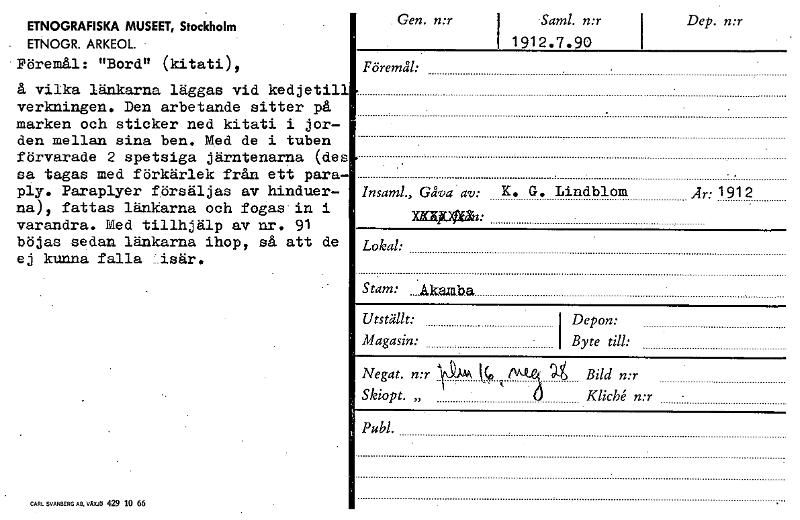 • Katalogkort ur Etnografiska museets arkiv.