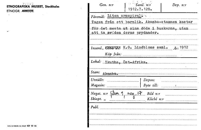 • Gm my 'Sarril: kår. i Dep. n:r 1912.7.128. i Föremål: Liten armspiral • ETNOGRAFISKA MUSEET, Stockholm ETNOGR. AFRIiTef. Tagen från ett barnlik. Akamba—stammen kastar för det mesta ut sina döda buskar... Visa hela
