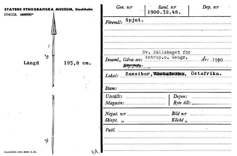 • Gen. n:r Samla n:r I Dep. n:r 1900.32.48. Föremål: Spjut. Sv. Sällskapet för Antrop.o. Geogr. Insaml., alm av: 19p0 Lokal: Z an s ib ar 9 nMataa~z. Östafrika. Stam: Utställt: I Depon: Magasin: ... Visa hela