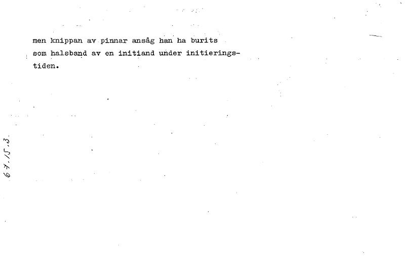 ETNOGRAFISKA MUSEET, Stockholm ETNOGR. ARKEOL Gen. n:r Saml. n:r 1967. 15 • 3. Dep. n:r CARL SV Föremål. Initieringsföremål för pojkar. Bestående- av en längre med geometriska figurer dekorerad pinne samt tio enklare mindre pinnar samman- hållna med snören, som löper genom hål i pinnar- nas ena ände....Znrena är.fästade vid ett .grövre dubbelt snöre. Funktionen är okänd av givaren, men knippan av pinnar ansåg han ha burits som halsband av en initiand under initierings- tiden. Insaml. ,GUvacmw Arkitekt J. Rubler Ar: 1966 2 4F4khz: vänd! Lokal: Botswana Stam: Na.ron-busehmän Utställt: Depon: Magasin: Byte till: Negat. n:r Bild n:r Skiopt. „ Kliché n:r Publ. [ocr]