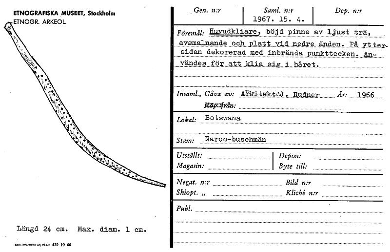 CARL SVANBERG AB, VAXJ0 429 10 66 Dep. n:r Gen. n:r I Saml. n:r 1967. 15. 4. Föremål Huyudkliare, böjd pinne av ljust trä, avsmalnande och platt vid nedre änden. På ytter- sidan dekorerad med inbrända punkttecken. An- vändes för att klia sig. låret. Insaml., Gåva av: ArkitektaJ. Ruciner År: 1966 itatPuink: Lokal: Botswana Stam: Naron—buschmän Utställt: DePon: Magasin: I Byte till: Negat. n:r Bild n:r Skiopt. „ Kliché n:r Publ. Längd 24 cm. Max. diam. 1 cm. ETNOGRAFISKA MUSEET, Stockholm ETNOGR. ARKEOL. [ocr]Stäng