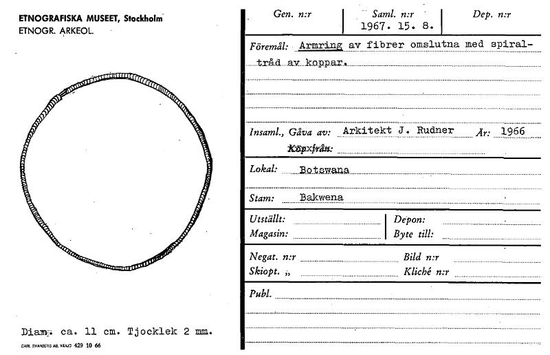 • ETNOGRAFISKA MUSEET, Stockholm ETNOGR. ARKEOL. Gen. n:r Saml. n:r ' Dep. n:r •I 1967. 15. 8. Föremål: Armring av fibrer omslutna med spiral- tråd .av.koppar.. Insaml., Gåva av: Arkitekt J. Rudner År:... Visa hela