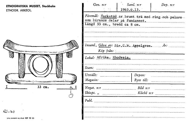 • ETNOGRAFISKA MUSEET, Stockholm ETNOGR. ARKEOL. Gen. n:r ISaml. n:r I 1963.6.13. Dep. n:r 33 cm. Föremål: .ackstöd_av_brunt_trälned-ring-och-pelare som bärande delar på fundament. Längd 33 cm., bredd... Visa hela