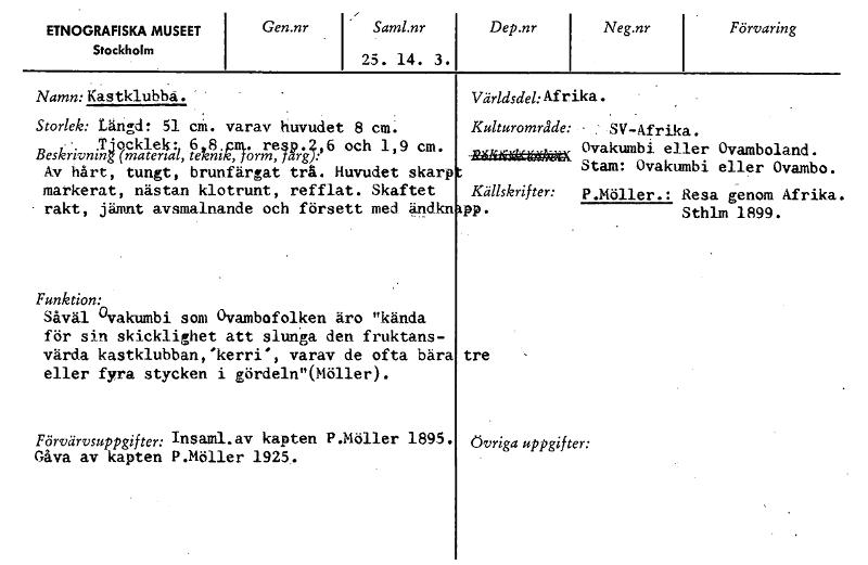 ETNOGRAFISKA MUSEET Stockholm Gen.nr Saml.nr 25. 14. 3. Dep.nr Neg.nr Förvaring Världsdel: Afrika. Kulturområde: - SV-Afrika. Ovakumbi eller Ovamboland. Stam: Ovakumbi eller Ovambo. Källskrifter: P.Mö...