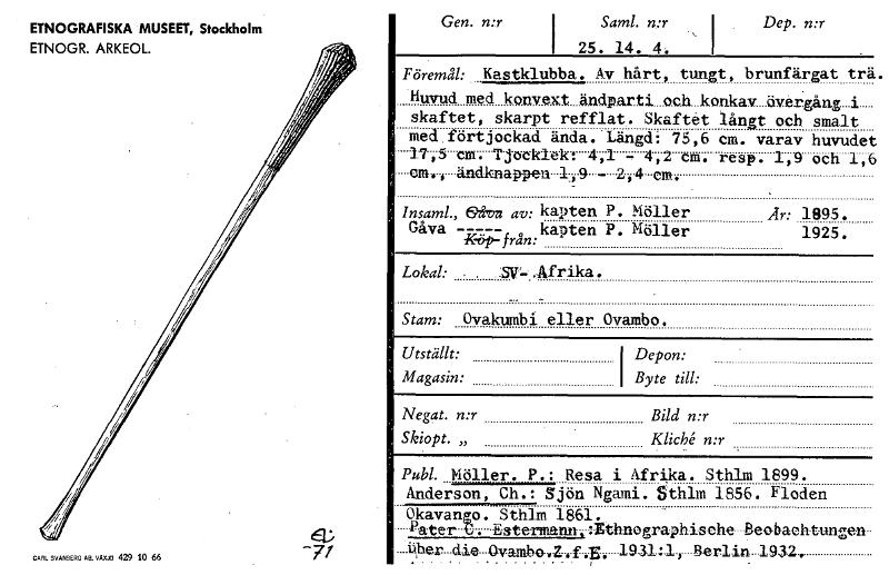 CARL SVANBERG AB. VAVJO 429 10 66 -71 ETNOGRAFISKA MUSEET, Stockholm ETNOGR. ARKEOL. Gen. n:r Sml. 25.a14.n; Dep. n:r • F öremål: Kastklubba Ay hårt, tungt, brunfärgat trä Huvud med konvext ändp.arti...