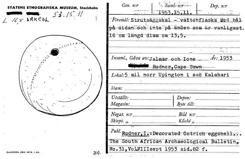 STATENS ETNOGRAFISKA NIUSEUJIA, Stockholm lifflegia. • ELANDERS. GBG. 3879. 1.64. Gen. n:r 7 ', `Saml::n.i.-:,,, - Dep. n:r 'Pöreniåk.Str-tits.ääääkal ;-::iliattflaSkä i vanl-i-ga,s-. 16 c-m--Iäng-d- diaur -ca -1-3,5. - --. — Insaml., Gåva av:Jal-mar.. o.ch.__Ione.... Jr: 1953 1.11 ----Rudne-ry-Cape Tam Lokal:5 mil norr Upington i s::ö Kalahari Stam: Utställt: iDepon: Magasin: Byte till: Negat. n:r Bild n:r Skiopt. „ Kliché,, - Publitudn-e-r-4 - -; - :-Becio-rate-d---0-s-trich---eg-gshell... .Archaeological 13ulletin,, 1953 sid.82 f. The South African No.31,VolVIIIsept [ocr]