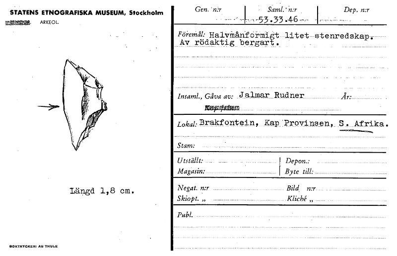 • STATENS ETNOGRAFISKA MUSEUM, Stockholm ARKEOL Gen. • n:r Sarg n:r i Dep. n:r -53,33 ufulgi Föremål: HalvMånformi t litet stenredskap. Av rödaktig bergart. Insaml., Gåva av: Ja1mar Rudner År: ..... rge... Visa hela