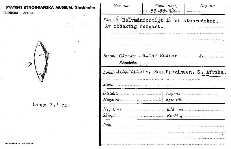 Gen. n:r Dep. n:r - 55,33.41- Föremål:..Haliiffiånformigt J:it et stenredskap. Av rödaktig bergart STATENS ETNOGRAFISKA MUSEUM, Stockholm ITME11 ARKEOL Insaml., Gåva av: J almar Rudner År: • Al Lokal: Brakfontein, Kap. Provinsen, S . Afrika . Stam: Utställt: Magasin: Depon.: Byte till: Längd 2,2 cm. Negat..n:r Skiopt. „ Bild n:r Kliché „ Publ. BOKTRYCKERI AB THULE [ocr]